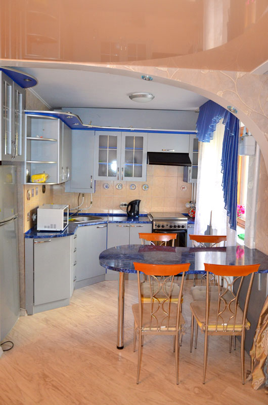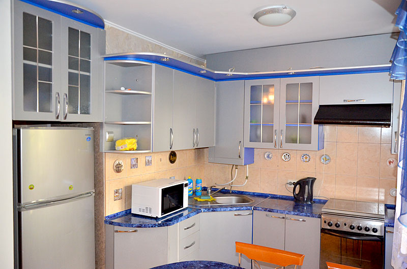 Кухонне обладнання: електрочайник, холодильник, газплита, мікрохвильова піч, витяжка, весь необхідний посуд, кухонний стіл і стільці, газова колонка.