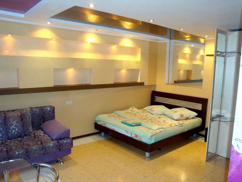 Мебель и оборудование: двухспальная кровать, диван-кровать, постельное белье и полотенца, два встроенных зеркальных шкафа, кондиционер, телевизор (подключен к кабельному ТВ), ДВД-плейер, утюг и гладильная доска.