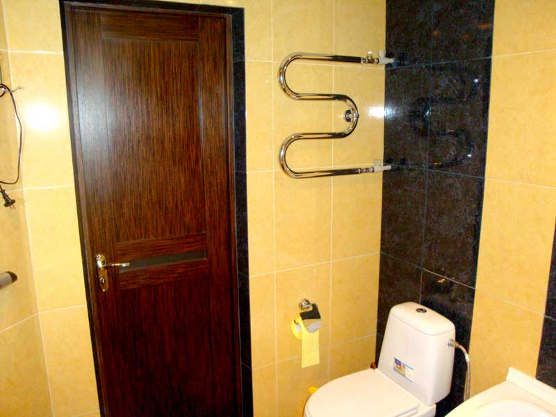 Ванная комната: Дизайн ванной комнаты выполнен в ретро-стиле. Большая угловая ванная с душем, фен, туалет, умывальник с большим встроенным зеркалом.
