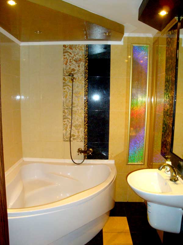 Ванна кімната: Дизайн ванної кімнати виконаний в ретро-стилі. Велика кутова ванна з душем, фен, туалет, вмивальник з великим вбудованим дзеркалом.