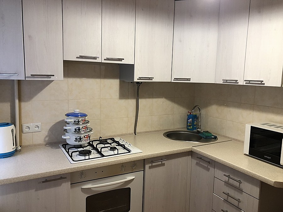 Кухонне обладнання: СВЧ-піч, холодильник, газплита, витяжка, електрочайник, весь необхідний посуд, газова колонка.